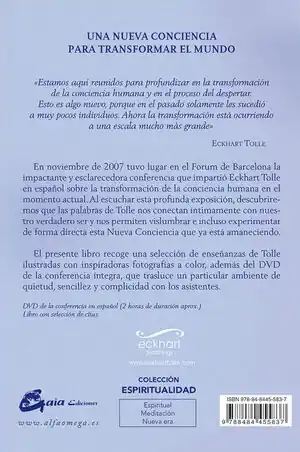 En noviembre de 2007 tuvo lugar en el Forum de Barcelona la impactante y esclarecedora conferencia que impartió Eckhart Tolle en español sobre la transformación de la conciencia humana en el momento actual. Al escuchar esta profunda exposición, descubriremos que las palabras de Tolle nos conectan íntimamente con nuestro verdadero ser y nos permiten vislumbrar e incluso experimentar de forma directa esta Nueva Conciencia que ya está amaneciendo.El presente libro recoge una selección de enseñanzas de Tolle ilustradas con inspiradoras fotografías a color, además del DVD de la conferencia íntegra, que trasluce un particular ambiente de quietud, sencillez y complicidad con los asistentes. «,