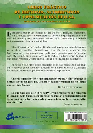 Este curso recoge las técnicas del Dr. Milton H. Erickson, célebre psiquiatra norteamericano considerado como el mejor hipnotizador médico del mundo y muy reconocido por su trabajo fructífero y a menudo «milagroso» con clientes «imposibles» .El genio especial de Grinder y Bandler reside en su capacidad de observar a este extraordinario hipnotizador en acción, darse cuenta de ómo hace para lograr sus asombrosos resultados y, después, describir detalladamente -empleando los métodos de la PNL- qué hace, cómo lo hace, a qué pistas responde y cómo encaja todo ello en una unidad coherente.El éxito de este curso de los creadores de la PNL consiste en que cualquier persona puede aprender a repetir los mismos procesos y conseguir los mismos resultados que este extraordinario hipnotizador.La hipnosis es una poderosa herramienta de comunicación eficaz que realiza una función específica: amplifica los mensajes y suscita respuestas más intensas.Ya se trate de resolver problemas y limitaciones personales, hablar en público, escribir un relato, practicar psicoterapia, dirigir una empresa o vender un producto, la hipnosis permite hacerlo mejor y tener un mayor impacto.Este curso práctico de hipnosis se basa en las técnicas del extraordinario hipnotizador médico Milton H. Erickson, y ha sido modelado según las pautas de la PNL por los creadores de este sistema.El curso incluye inducciones sencillas, inducciones avanzadas, reencuadre en trance, técnicas específicas y calibrado; y contiene aplicaciones prácticas para educadores, terapeutas, publicistas, ejecutivos, padres y comunicadores en general (escritores, locutores, actores, conferenciantes, etc.). «,